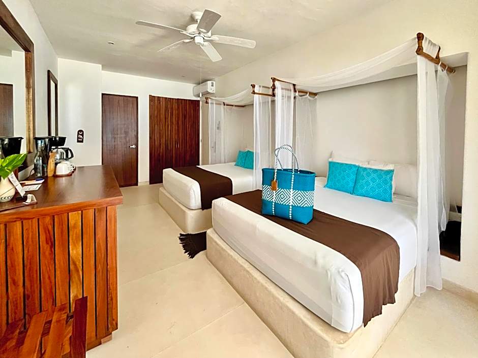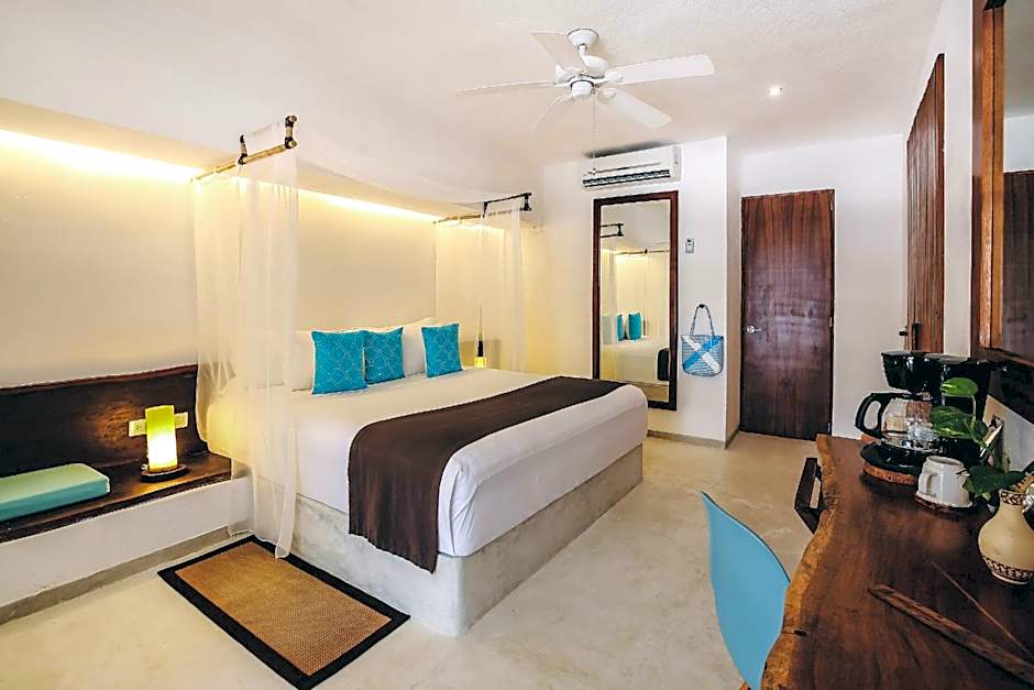 This has 3 king-size bedrooms and one small loft area with 1 queen sized bed, with a maximum capacity of 8 people ( 6 adults + 2 children), 3 bathrooms, one of which is en suite, a spacious living area, with lots of sofa space and table. The two furnished terraces are perfect for relaxing after a day at the beach or after an excursion to the various interesting sites in the area. Private hot tub on the terrace, outside sitting area with couches and beach towels 24 hours AC It is positioned on the first floor, access is up a stairway and it's located between the Yoga Palapa of our sister property The Beach Tulum and Ziggy’s Beach Club while sharing the same entrance with the restaurant.