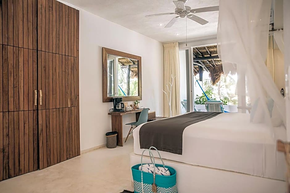This room is surrounded by a garden area, a few steps away from Tulum’s beach, the pool and deck area. The rooms are all ground floor. It features a furnished terrace patio, a hammock on the front, a private plunge pool and sofa facing the pool.